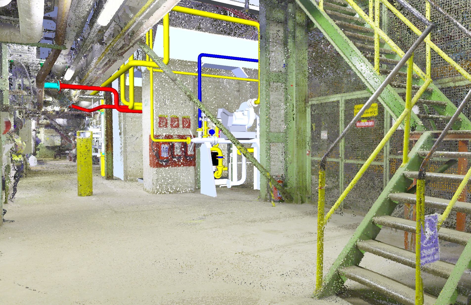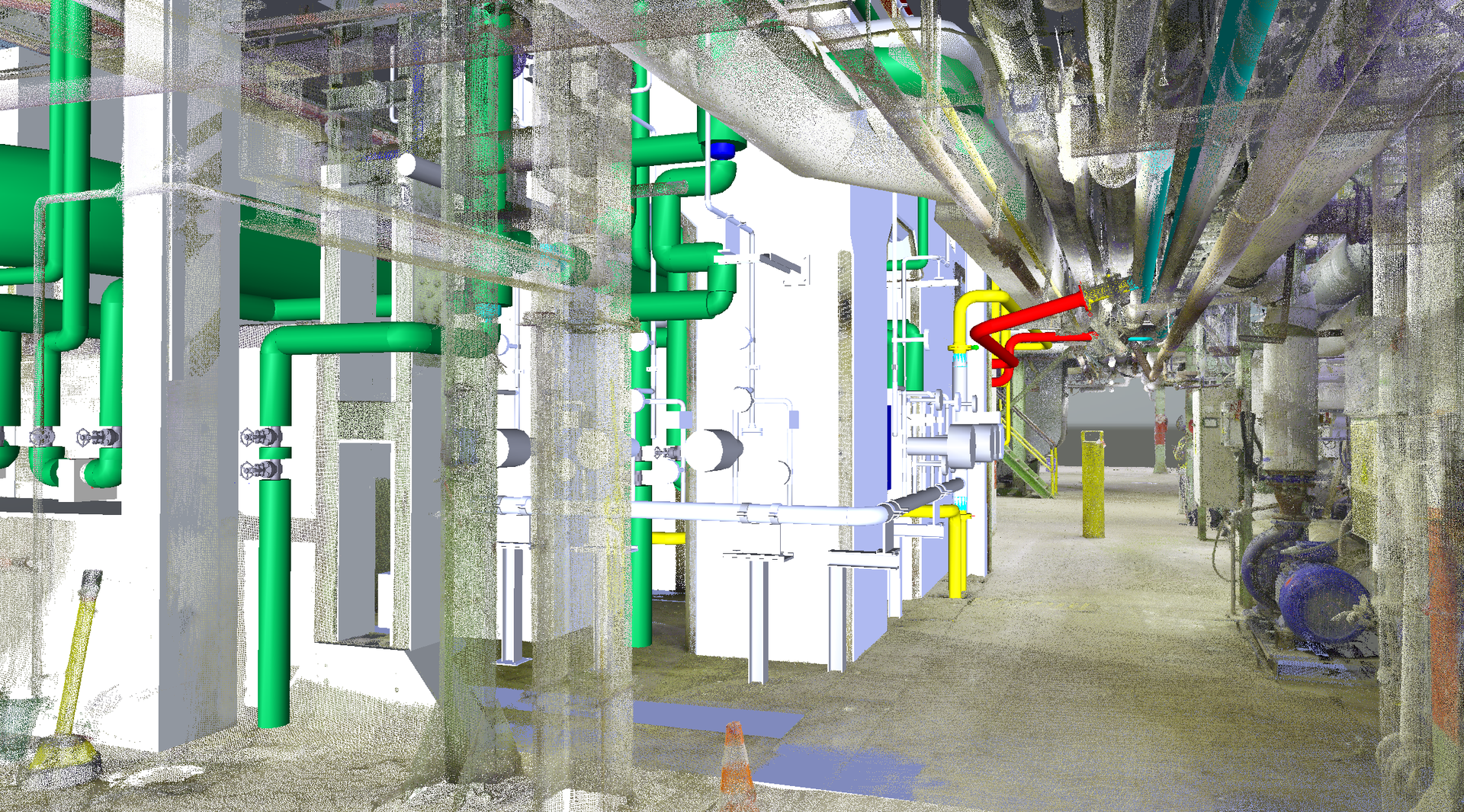 Le modèle a été développé en superposant la nouvelle installation sur le nuage de points du site réel, capturé par scan 3D. Cette technique permet de voir comment les nouvelles tuyauteries s'intègrent dans l'environnement existant et d'anticiper les conflits qui auraient coûté cher à corriger sur chantier.